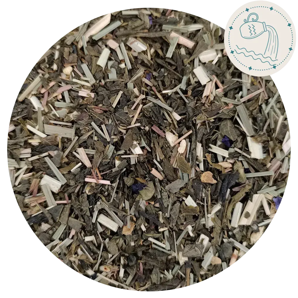 Composition : Thé vert Sencha de Chine, citronnelle, gingembre, citron vert, mauve.